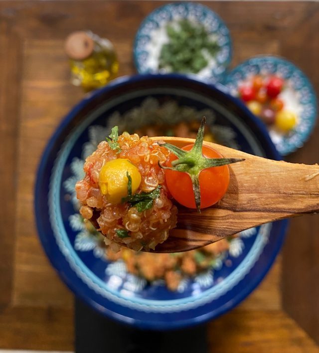 După ce e gata quinoa și am luat totul de pe foc, amestec ușor cu năutul, mai picur puțin ulei dacă e nevoie și adaug 3 legături zdravene de pătrunjel verde cu frunza măruntă, tocat (nu vă zgîrciți!). Pătrunjel românesc, de la mamaiele din piață, să le dea Dumnezeu sănătate și nouă minte, că mă doare sufletul când le văd cum îngheață în timp ce lumea cumpără zarzavat și rădăcinoase de la marile supermarketuri străine.