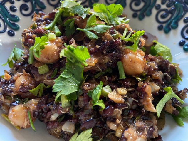 Dacă nu aveți năut. Soluție creativă. Pentru că nu am avut suficientă quinoa, am fiert separat la abur sau la foc mic și apoi am adăugat peste cele de mai sus, un pachet de 250 gr orez negru bio (AICI) Ne place mult, mult de tot acest orez negru, pentru că e deosebit de gustos, de dulce, de…puțin altfel decât orezul clasic. Dacă vreți să încercați, îmi place și cât de perfect se combină orezul negru fiert la abur cu supa linte marocană (rețeta AICI)