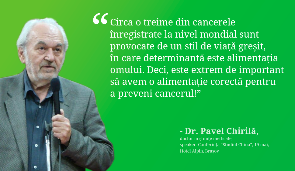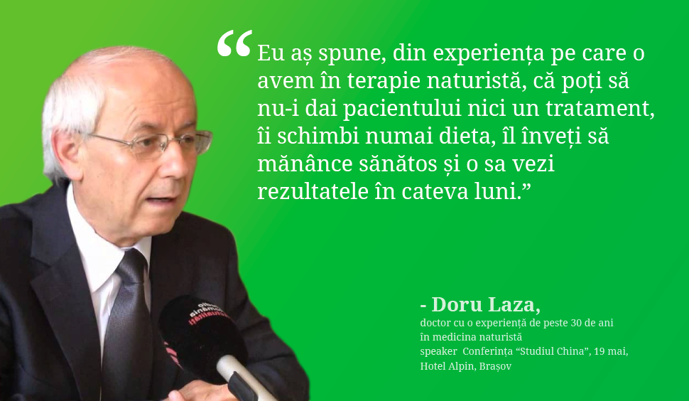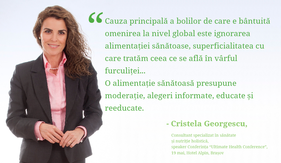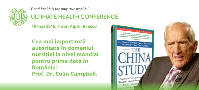 Zilele trecute am primit din partea doamnei Cristina Bâtlan, organizatorul Conferintei Prof. Dr. T. Colin Campbell, Ultimate Health Experience, invitatia de a participa la acest eveniment. Conferinta va avea loc pe 19 mai 2016, la Poiana Brasov, la Hotelul Alpin. Voi avea o prezentare, alaturi de Prof. Dr. Pavel Chirila si de Dr. Doru Laza.